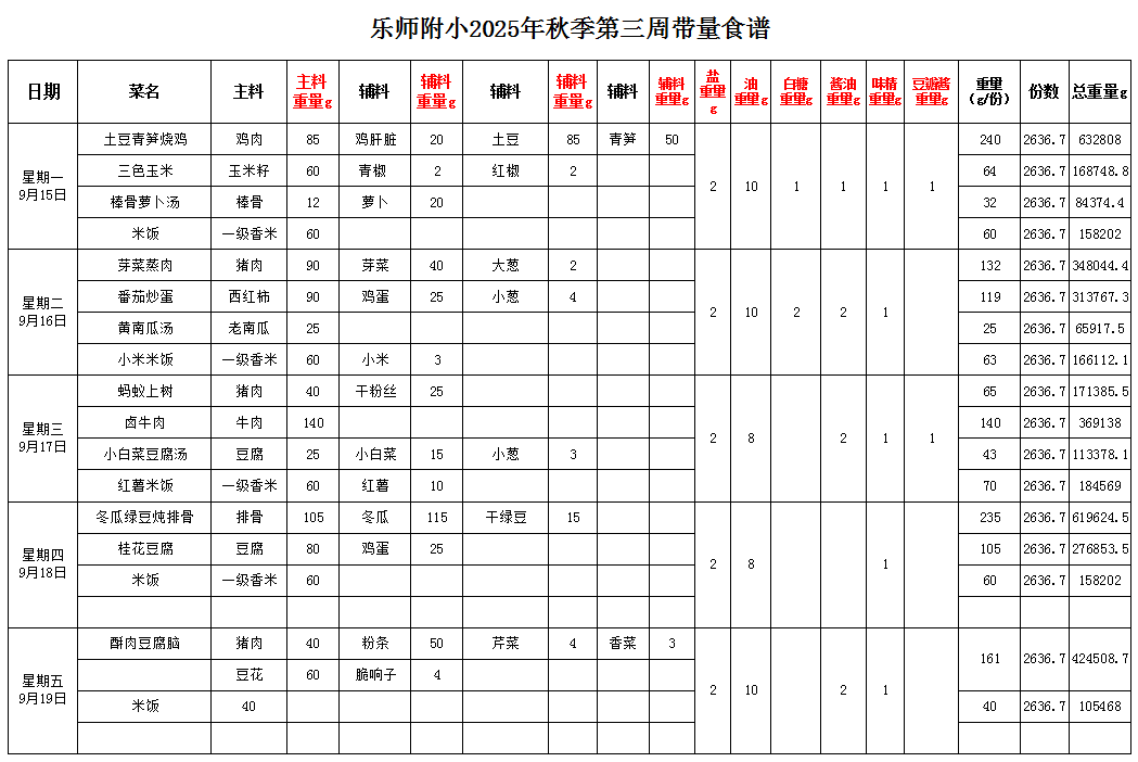 第3周带量食谱 | 2025年秋季学期