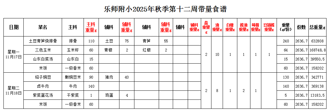 >>第12周带量食谱 | 2025年秋季学期